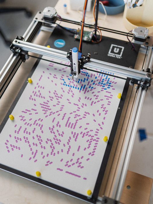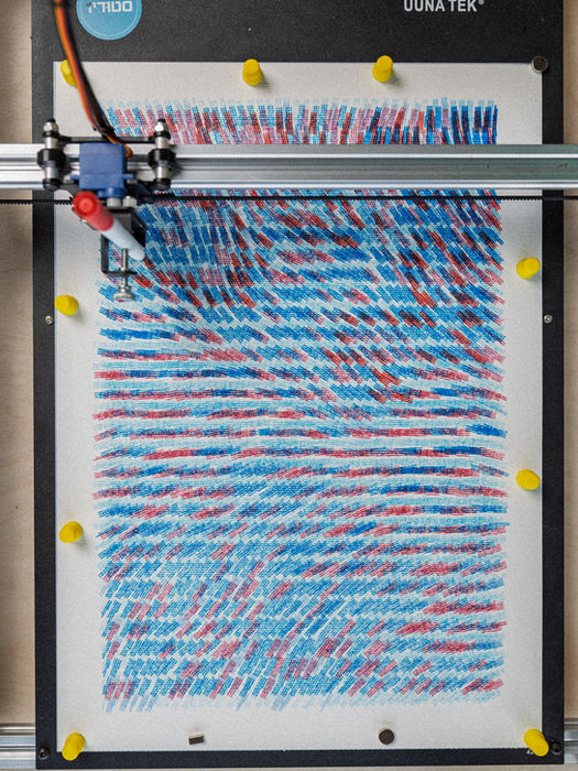 הפלוטר הוא מכונה שנעה על שני צירים (X&Y), ונשלטת ע״י המחשב. בשונה מהדפסה רגילה במדפסת סטנדרטית שמבוססת על פיקסלים - הפלוטר מבוסס על גרפיקה וקטורית - קווים מתמטיים חדים ואינסופיים. המכונה מתרגמת את הקווים הללו לתנועה פיזית, כשהיא גוררת עט דיו אמיתי על גבי נייר איכותי. התהליך משמר את הדיוק של התכנון המקורי, אך מעניק להדפס עומק וטקסטורה ששמורים בדרך כלל לרישום ידני. היצירה המוגמרת מייצגת את האיזון בין תחכום טכנולוגי מצד אחד, ופשטות אנלוגית ואסתטית מצד שני.